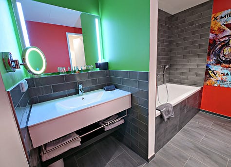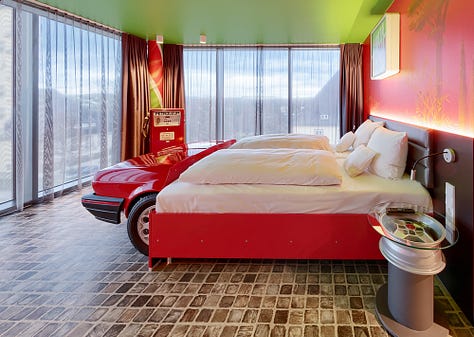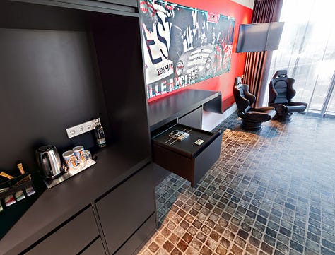 Revenind la hotel. Îmi doream mult să stau într-una din camerele tematice și în această perioadă a fost liberă camera Forza Italia. În total sunt 16 camere tematice cu mașini și acum am reușit să văd cam jumătate din ele. Ceea ce înseamnă că sigur mai urmează un episod de aventuri urbane în Stuttgart. Îți las aici câteva poze din camera de hotel și spune tu dacă nu merită să vii doar pentru asta până aici. ❤️😍