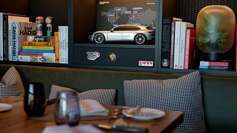 Dacă ți s-a făcut foame și vrei să încerci feluri de mâncare redenumite după modele Porsche, precum Macan (cârnați la grătar cu varză acră, piure de cartofi și muștar), Cayman (chiftele de vită cu salată de cartofi și sos de vin roșu Trollinger), Carrera (șnițel de porc cu cartofi prăjiți), Targa Florio (paste cu cu ragù de mistreț, dovlecel murat și ciuperci trase la tigaie) sau Spyder RS (piept de rață cu varză roșie în sos de vin roșu și tăiței de cartofi)